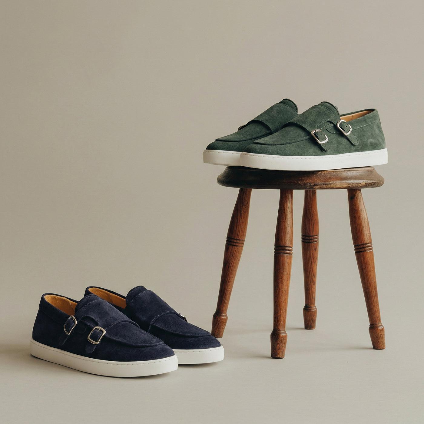 Sneaker fra Fliteless der klassisk monkstrap møter moderne komfort. Laget i mykt, fleksibelt semsket skinn med dobbel spenne og en lett sneaker-såle. Et stilrent valg som balanserer sport og stil – perfekt til både fritid og mer gjennomførte antrekk.